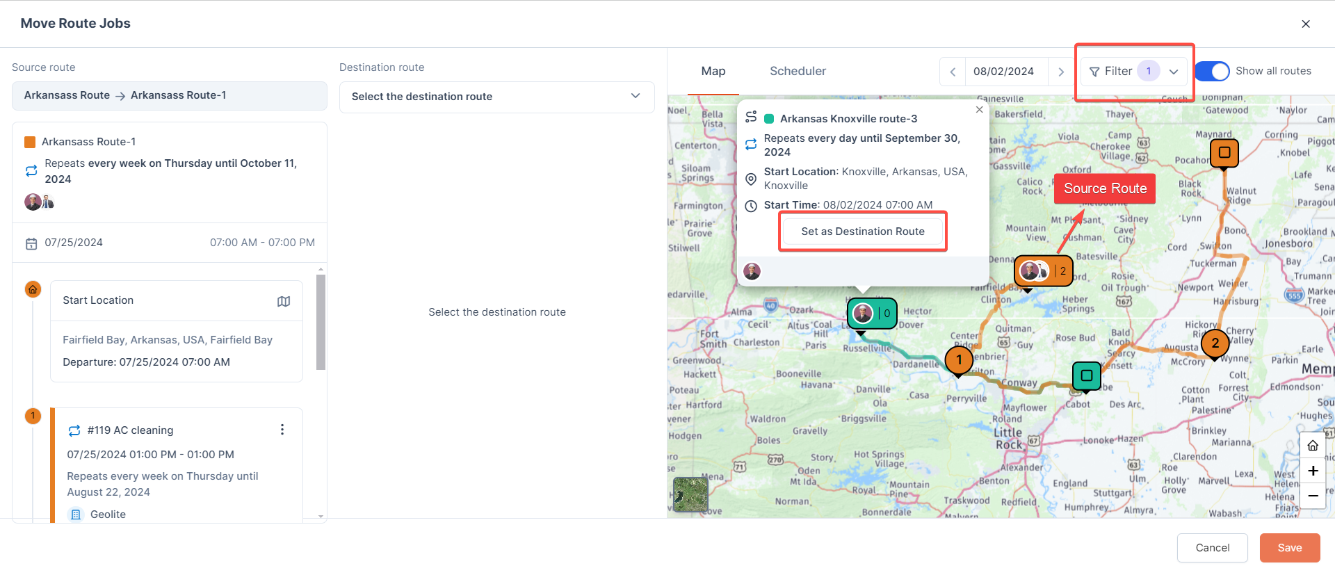 You can also use "Filter" to refine the routes displayed on the map based on skill sets, date and users. After setting the filters, click the “Apply” button.3. From the filtered routes, choose the closest route to the source route of your choice by considering- the overall route duration, jobs already assigned to the route, and travel time necessary between jobs and choose it as the destination route by clicking the “Set as Destination Route” button.
