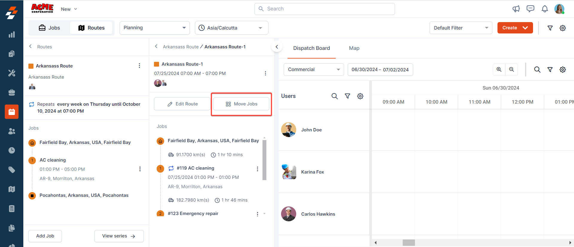 In such cases, you can move jobs efficiently and seamlessly between routes by carefully considering various aspects such as proximity and travel time to the job location, current workload of the destination route, along with technician's skills and availability. This ensures that the movement of the job is done with minimal disruption and maximum efficiency.