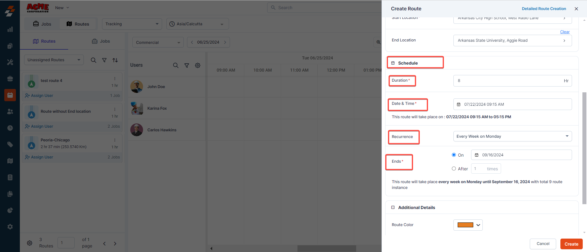 - Ends (Mandatory): Set either the specific end date and time or specify after how many occurrences the route should end. Based on your input, the route will take place with the total number of route instances determined.