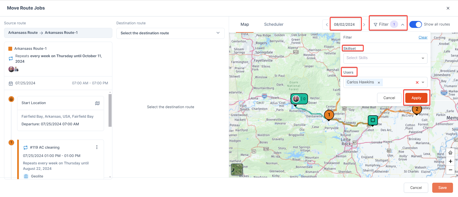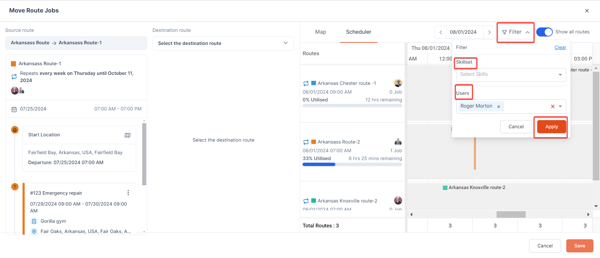 Note: You can also apply other filters such as skill sets, and users to refine the routes displayed on the scheduler. After setting the filters, click the “Apply” button.