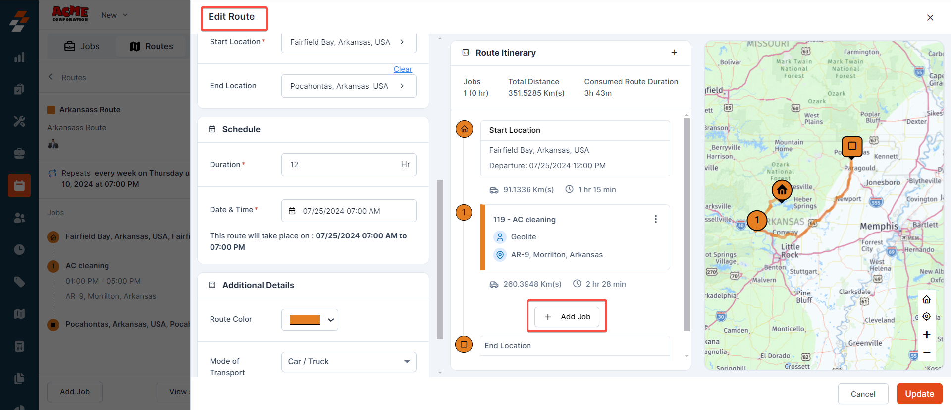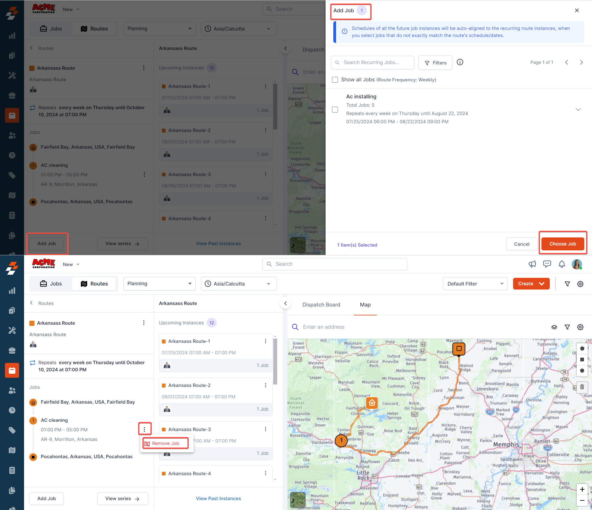 You can add one-off jobs by considering factors such as route instance duration, technician availability, geographical proximity of these jobs to the route, and the current job schedule. Here’s how: