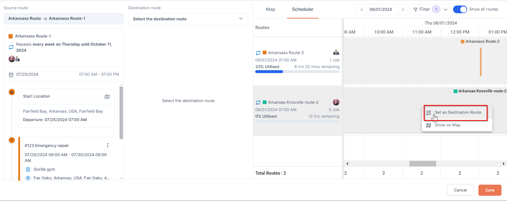 3. Based on the routes available, choose the right destination route by considering the overall route duration, jobs already assigned to the route, technician availability at the customer's preferred time, and proximity and travel time to the job location and “Set as Destination Route” by right clicking the route on the scheduler.