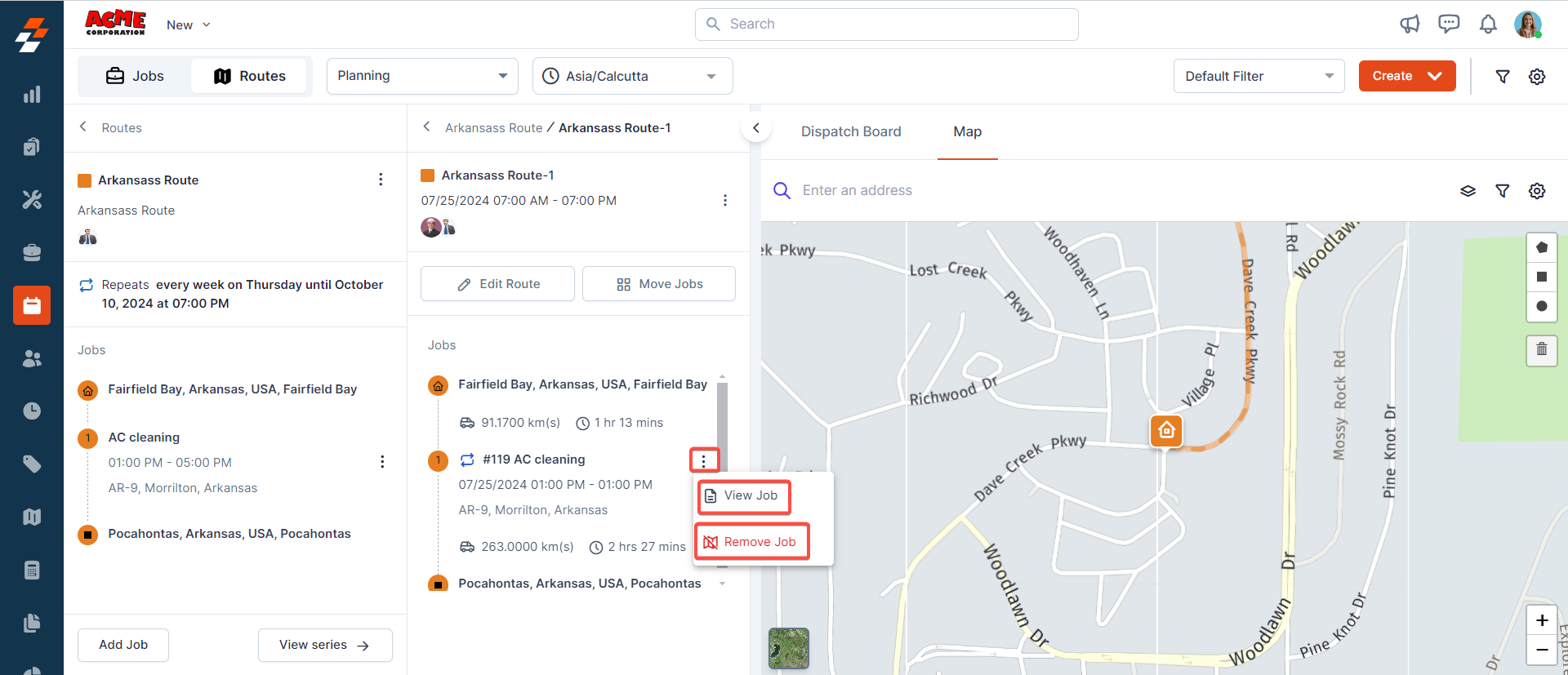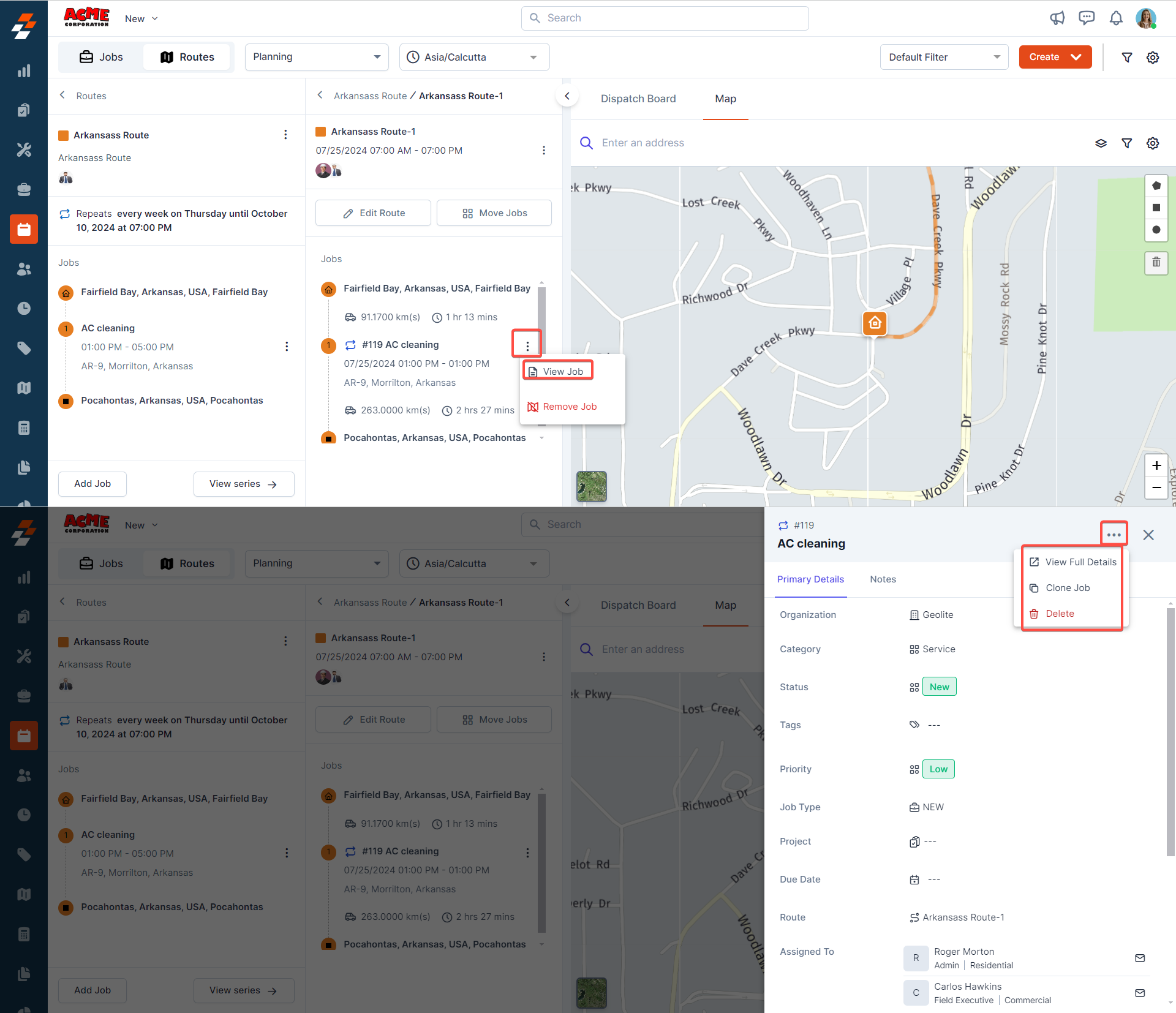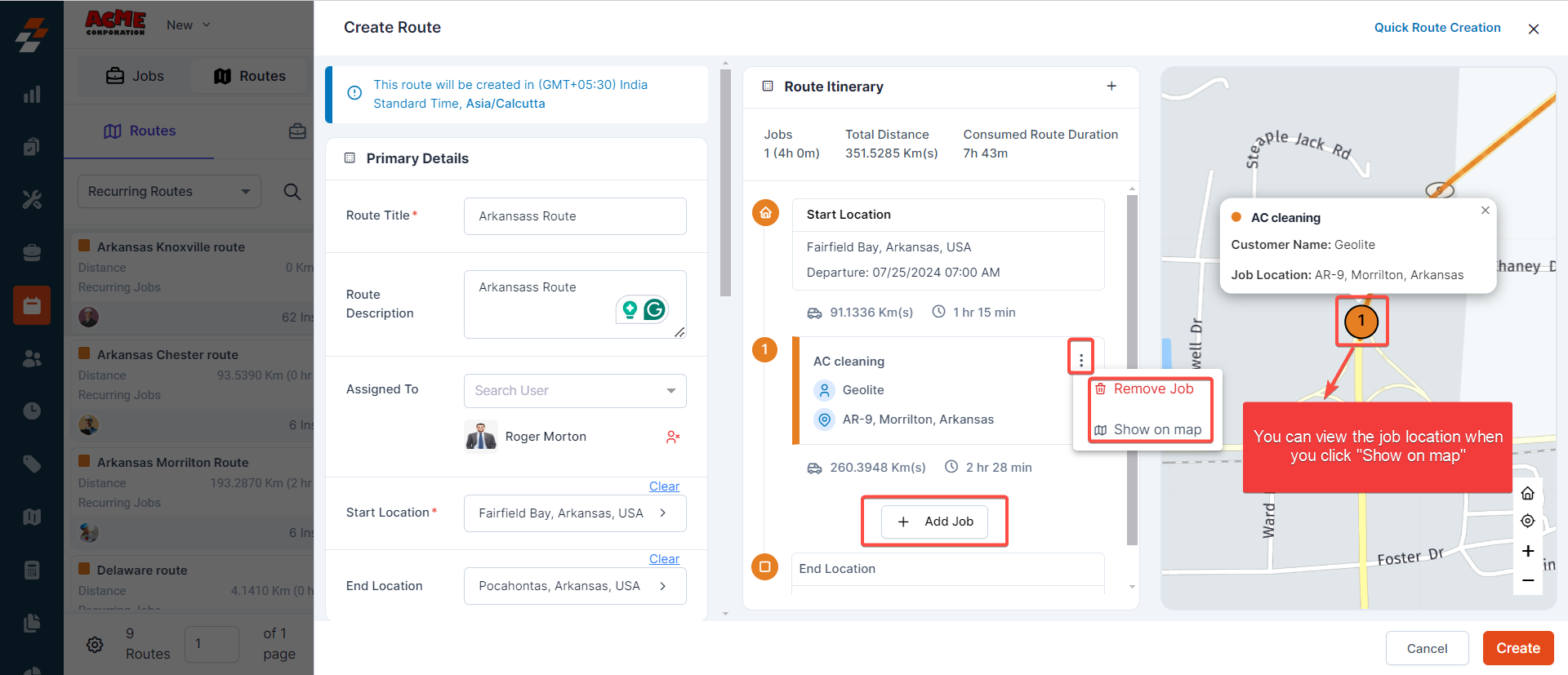 4. From here, you can also perform actions such as viewing the added job location on the map or removing the job by clicking the "kebab" (three-dot) icon next to it. Additionally, you can add more jobs to this route using the "+ Add Job" button and to reorder the jobs within the route so as to achieve the optimal route, avoiding unnecessary travel.