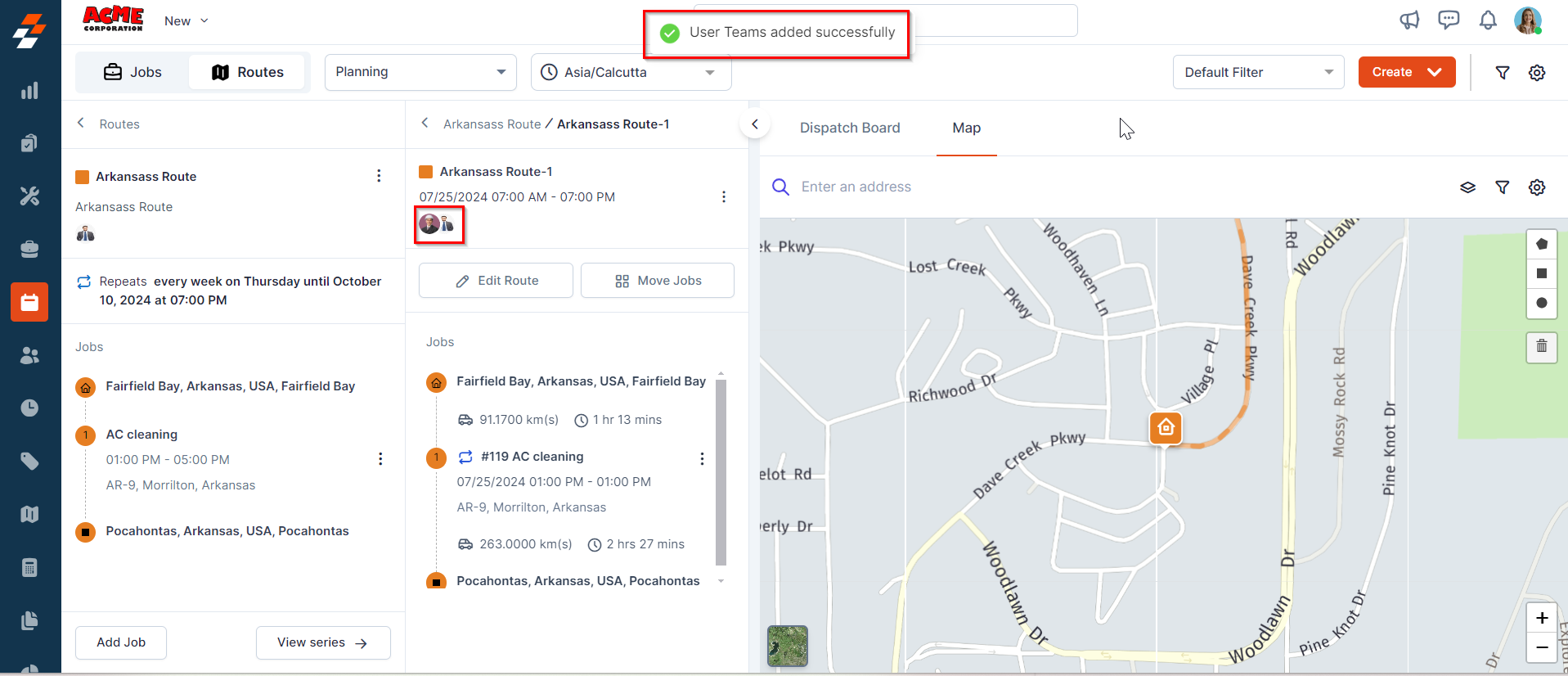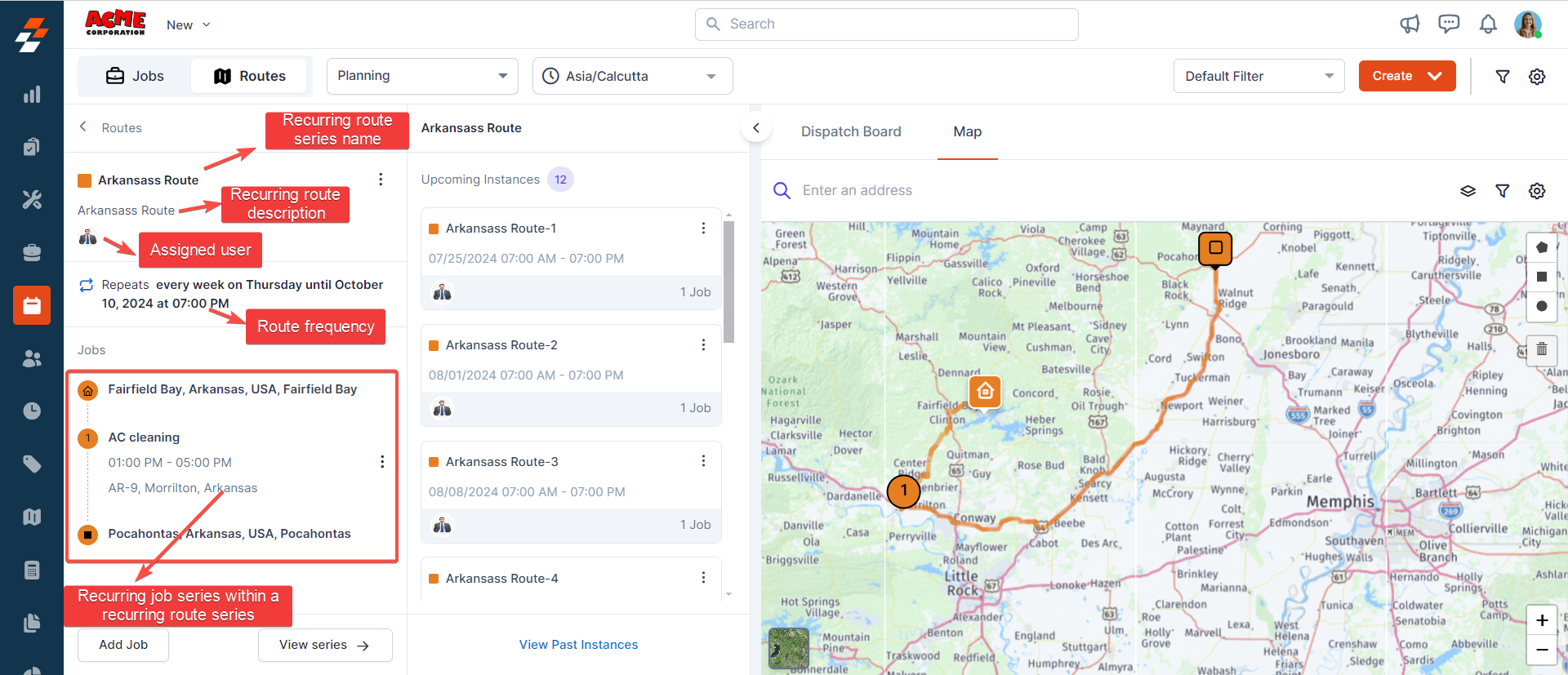 5. Once added, click the "Create" button. The recurring route series will be created successfully along with the recurring job series. This means, each future job instance within the recurring job series (master job) will be associated with the corresponding recurring route instances, as shown below: