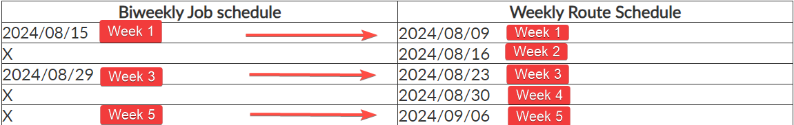 Suppose you have a biweekly job that starts on 2024/08/15 (Thursday) and weekly routes that start on 2024/08/09 (Friday). The job is scheduled to occur every two weeks, while the route follows a weekly schedule. In this case, here's how the association would be: