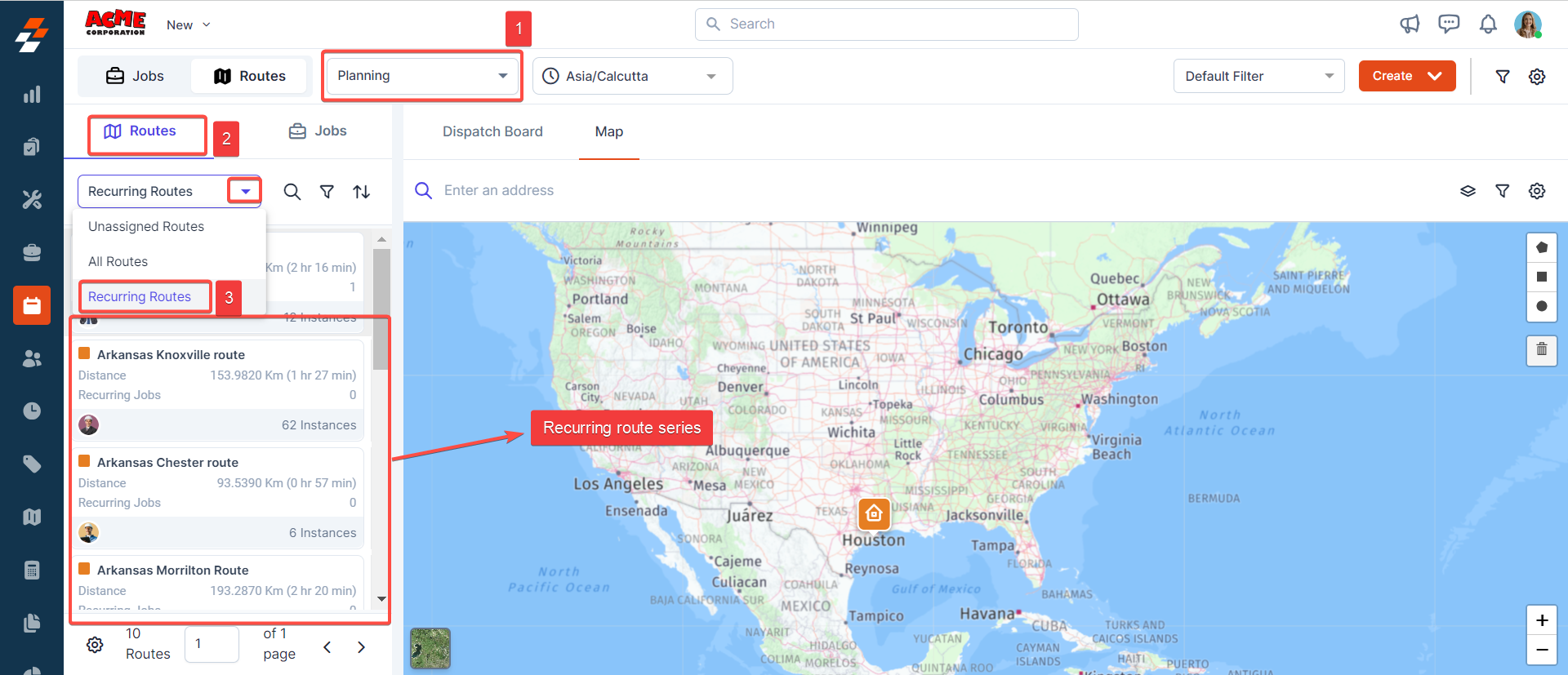 2. Once navigated to the “Planning” section, choose the “Recurring Routes” option from the dropdown menu under the Routes section. You can view the list of recurring route series with details such as the number of route instances and jobs within each series, travel time, distance, and assigned users.
