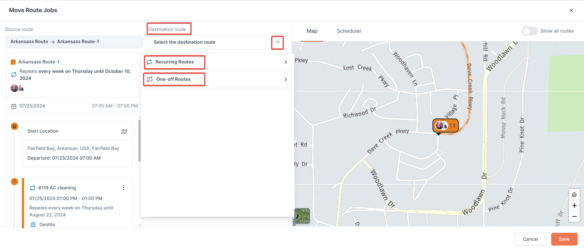 3. To move the job from the existing route (source) to another (target or destination), on the right, under “Destination route,” click the dropdown menu and choose either a "one-off route," or a "recurring route."