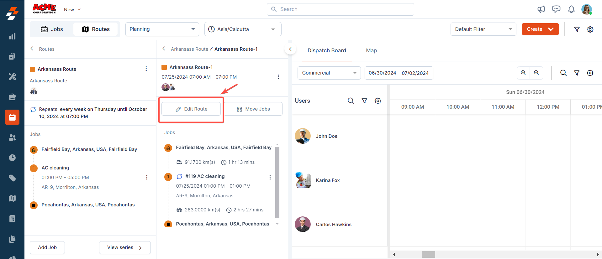 2. An "Edit Route" sidebar will appear where you can make necessary changes to the route, such as adding one-off jobs, assigning or unassigning users, changing the route start and end locations, adjusting the route schedule, and more.