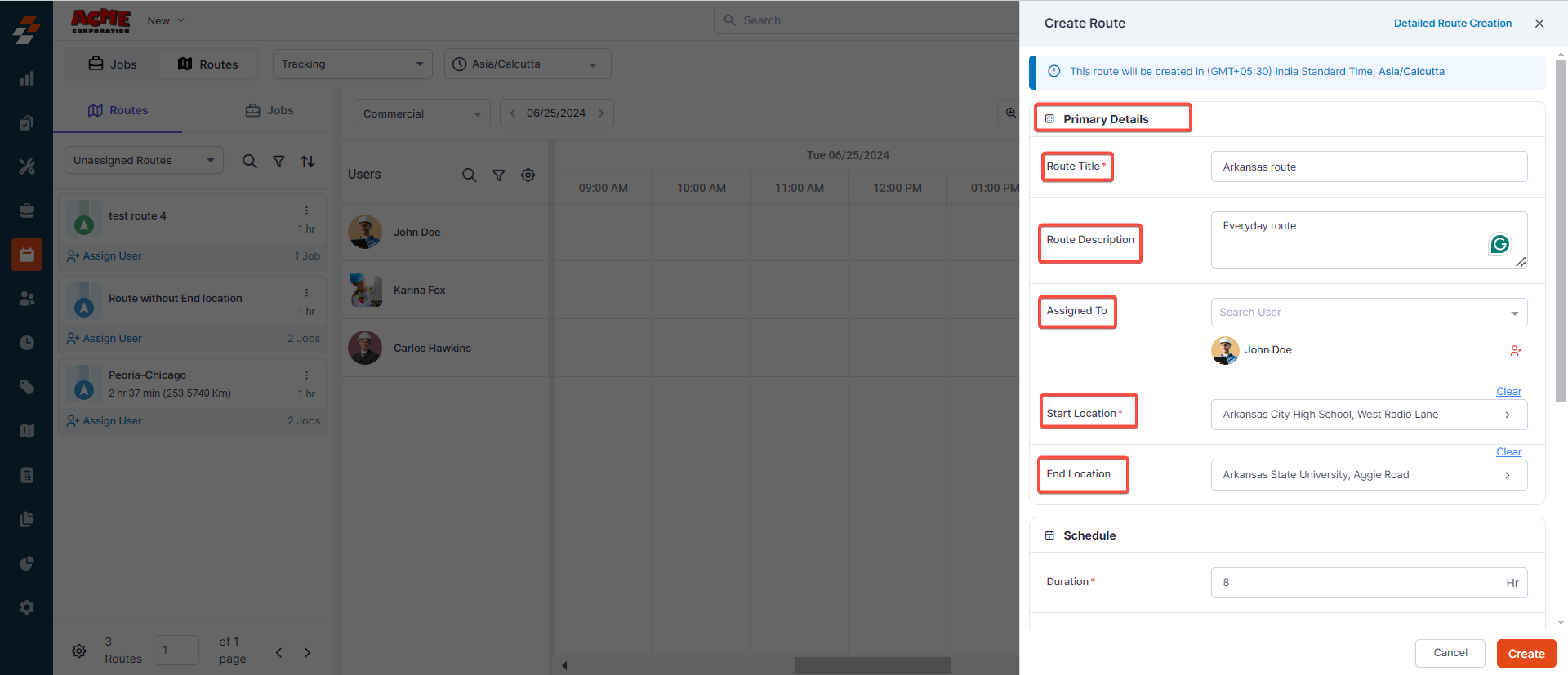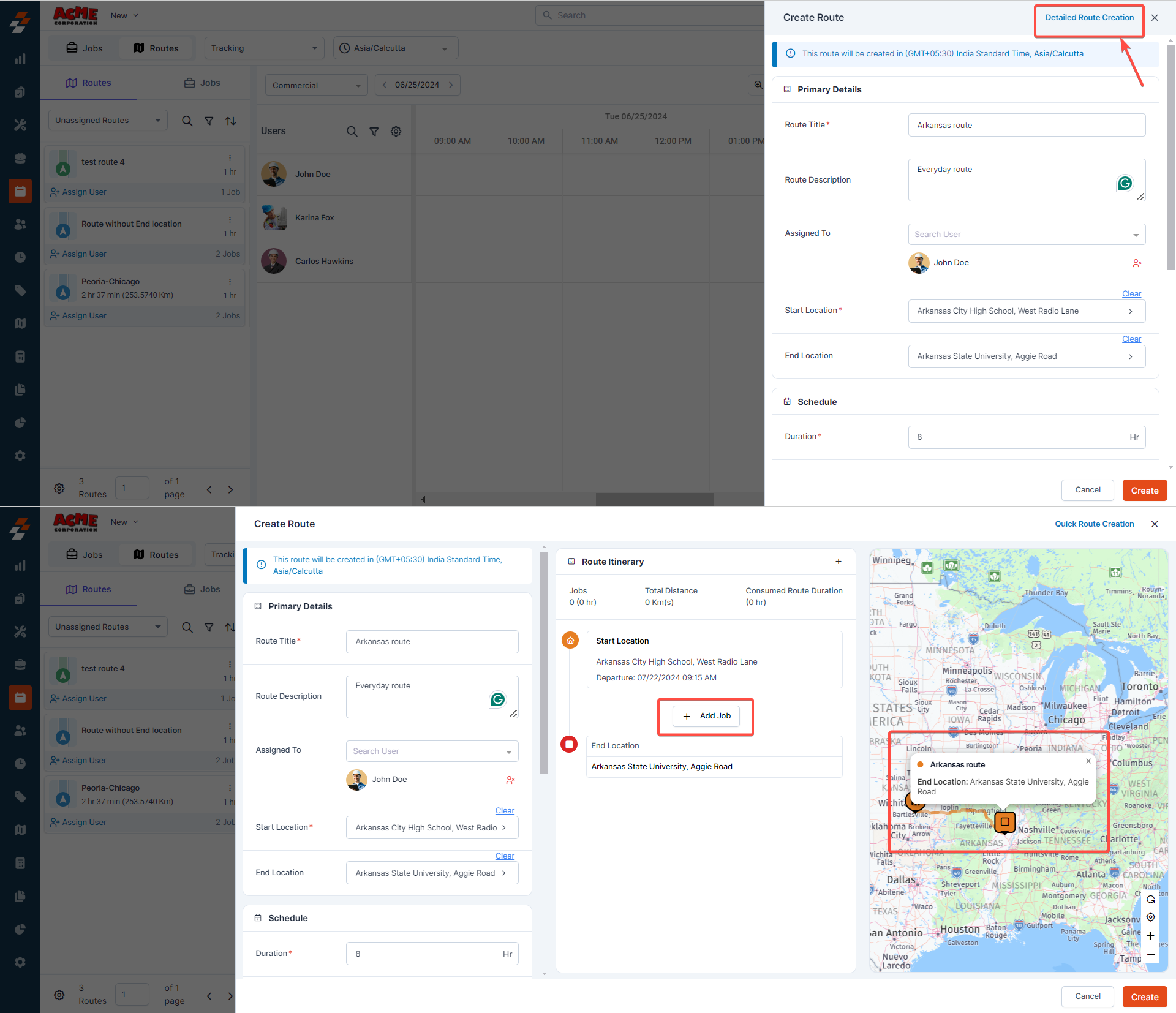 Note: If you want to add more details to the route, click the "Detailed Route Creation" button at the top right corner. This will expand the route creation with additional surfaces that enables provision not only to add jobs but also, view the route on the map as shown below.