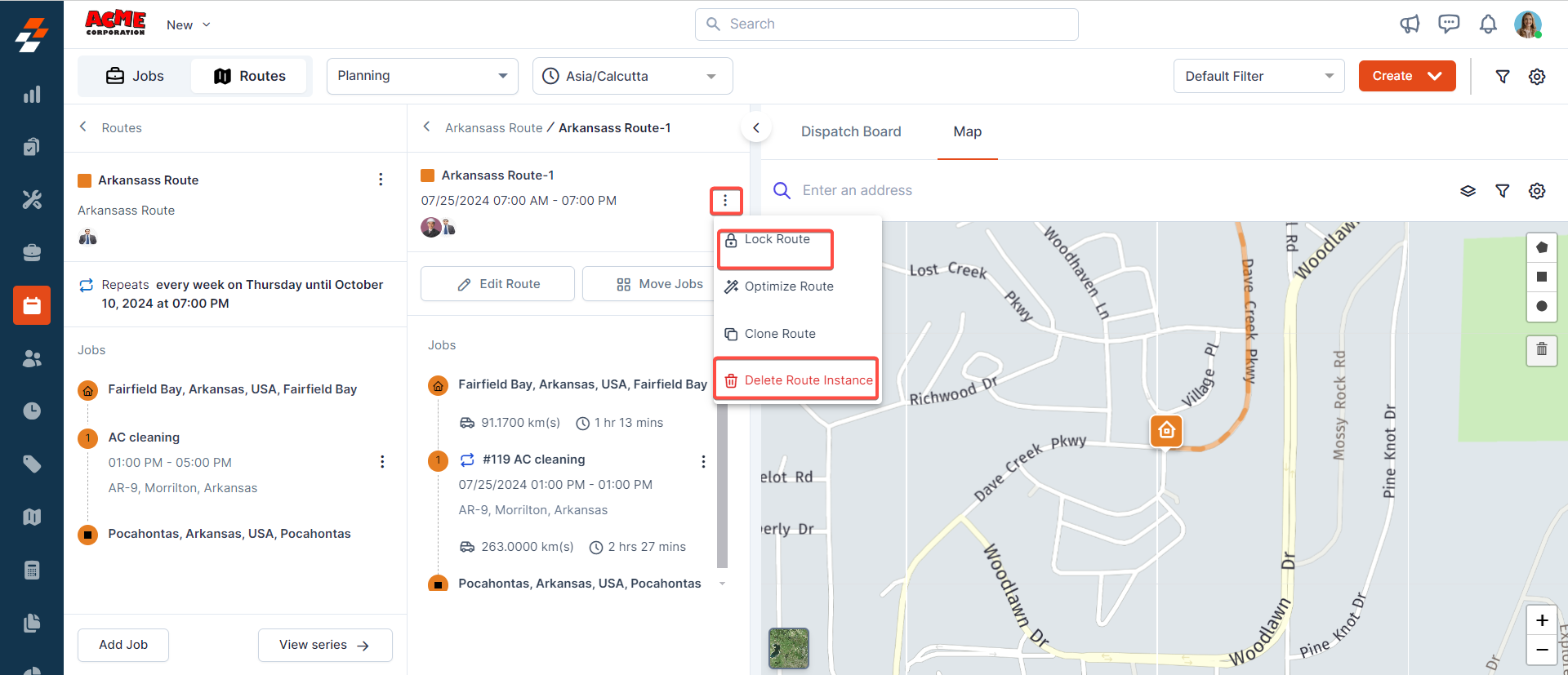 1. To lock or delete a route instance, click the “kebab” icon next to the route instance. From there, you can choose either “Lock Route” or “Delete Route Instance.”