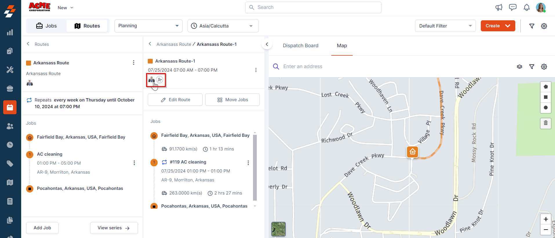 Creation of a recurring route carefully considers multiple aspects automatically - technician availability, route's available duration, frequency of job recurrences along with geographical proximity of these jobs to the route etc. This will enable you to create routes that not only optimize travel time and efficiency but also, ensure frequent jobs are completed on time and to a high standard by the assigned technician by virtue of familiarity with both customers and routes.