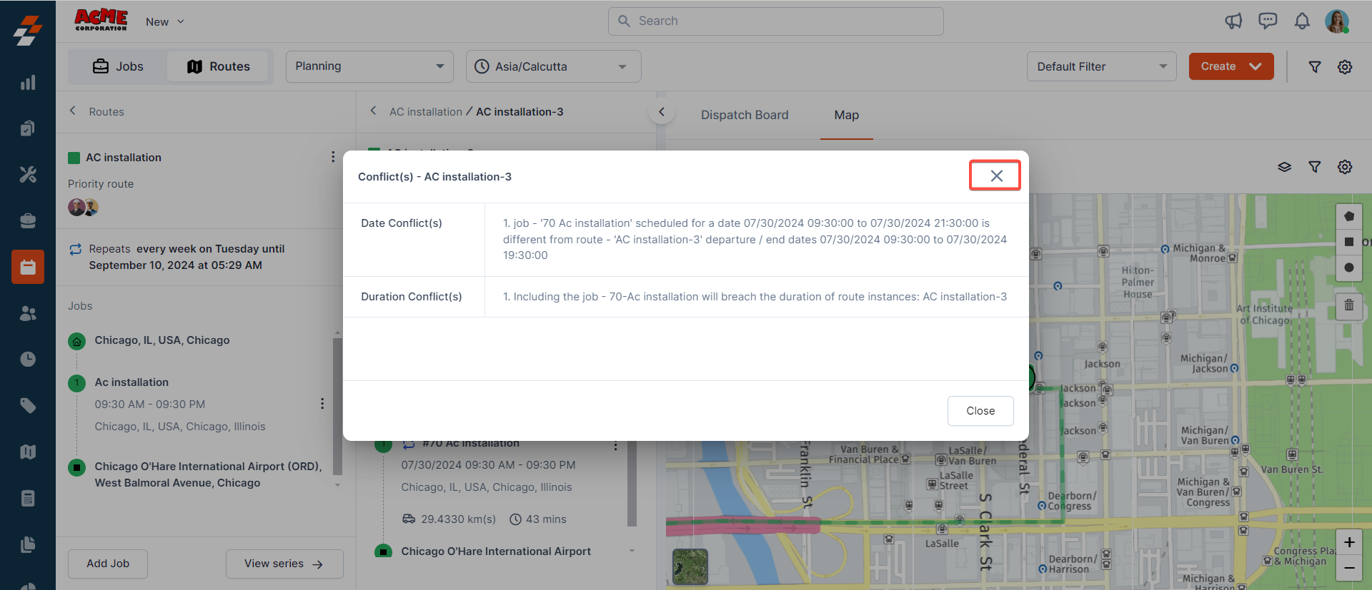 2. A pop-up appears listing the conflicts associated with the specific route instance. Based on the conflicts, you can choose to continue with them (or) make necessary changes to the route instance, such as assigning a different user, rescheduling job from the instance, moving jobs, and so on.