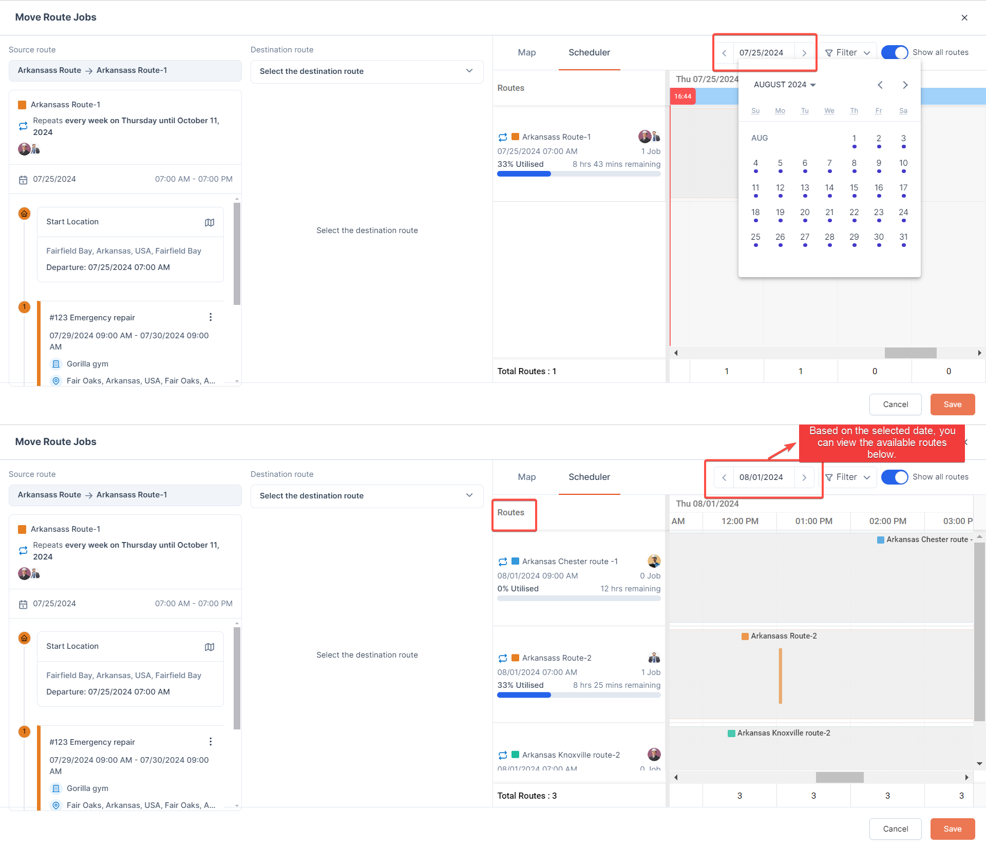 2. You can also change the date according to the customer’s preference using the "date picker" on the top right. This allows you to view the selected date's routes along with their duration and associated jobs on the scheduler.