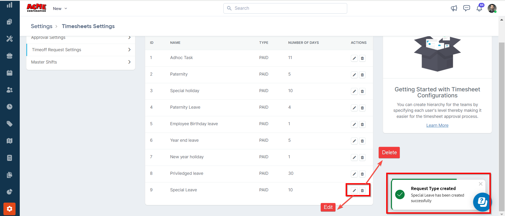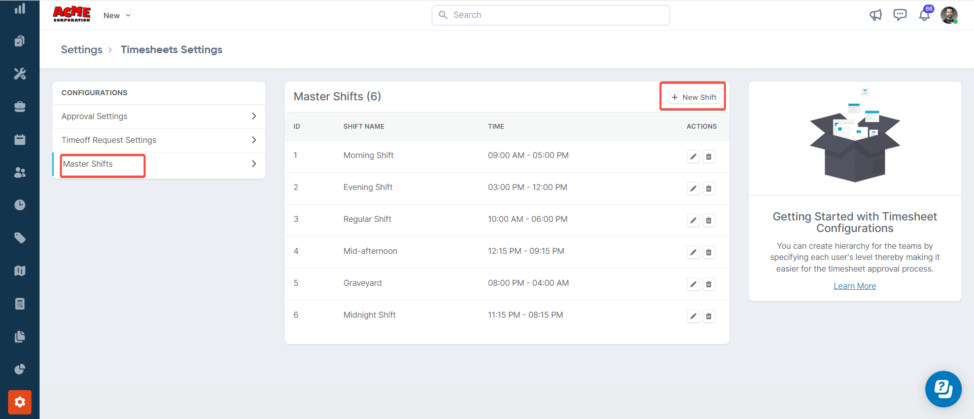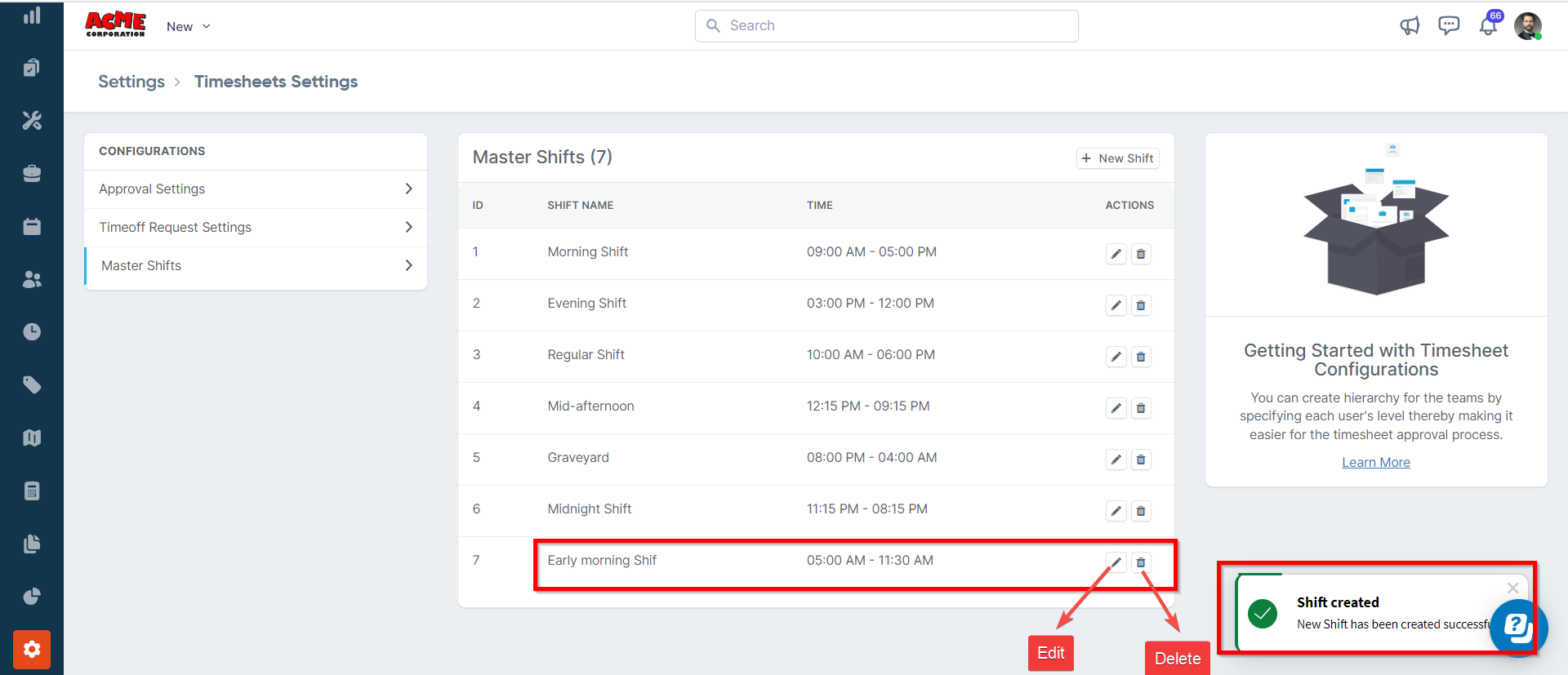 3. After saving the shift, you can remove/edit using the Delete and Edit icon available under the Action column.