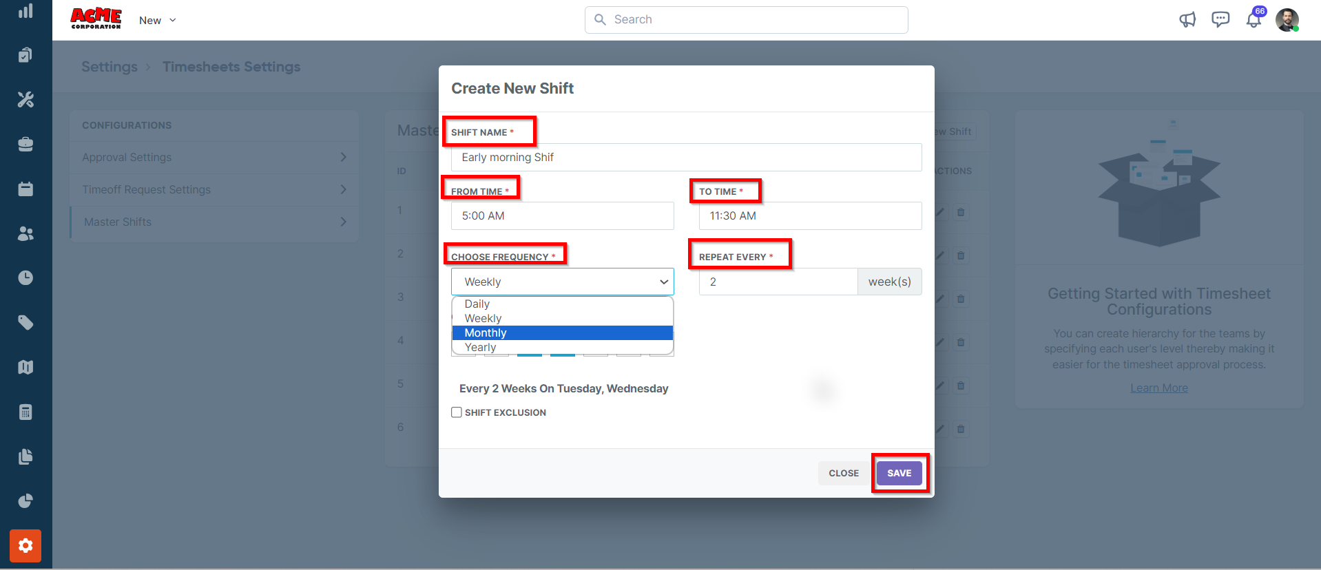 2. In the pop-up, enter Shift Details and click the “Save” button