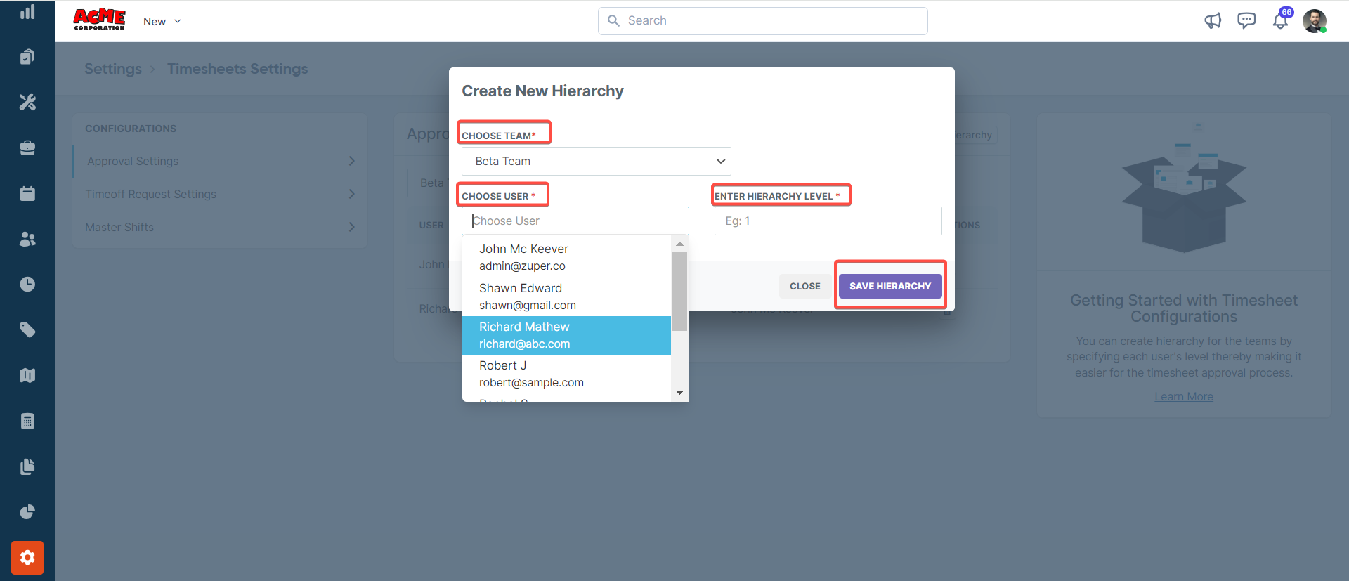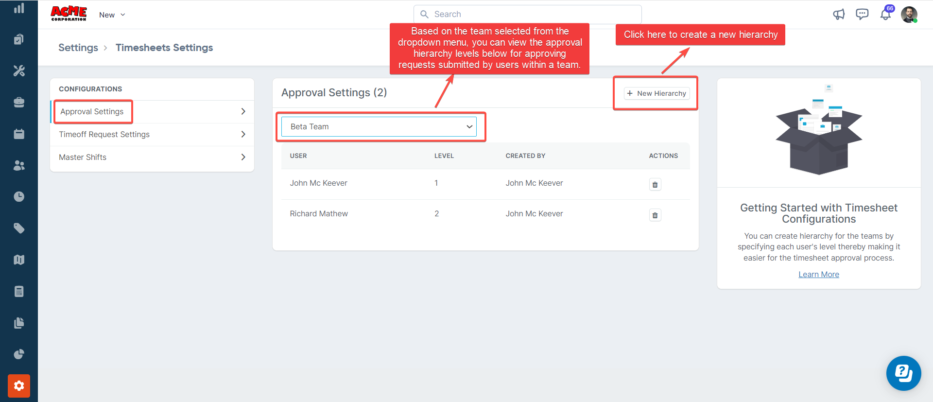 In this section, you can view the approval hierarchy levels for approving requests submitted by users within a team, and you can create a new approval hierarchy. To create a new approval hierarchy, follow these steps: