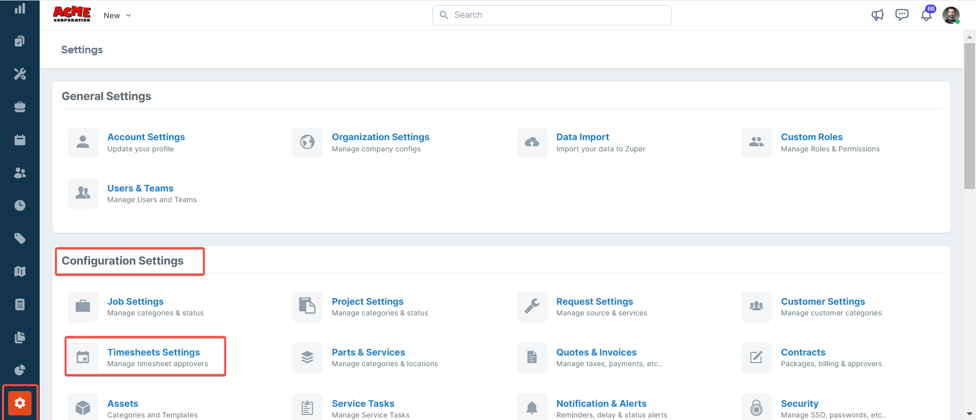 1. Select the “Settings” icon from the left navigation menu. Under Configuration Settings, choose “Timesheet Settings.” You can configure the following options: