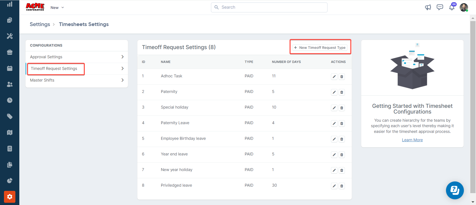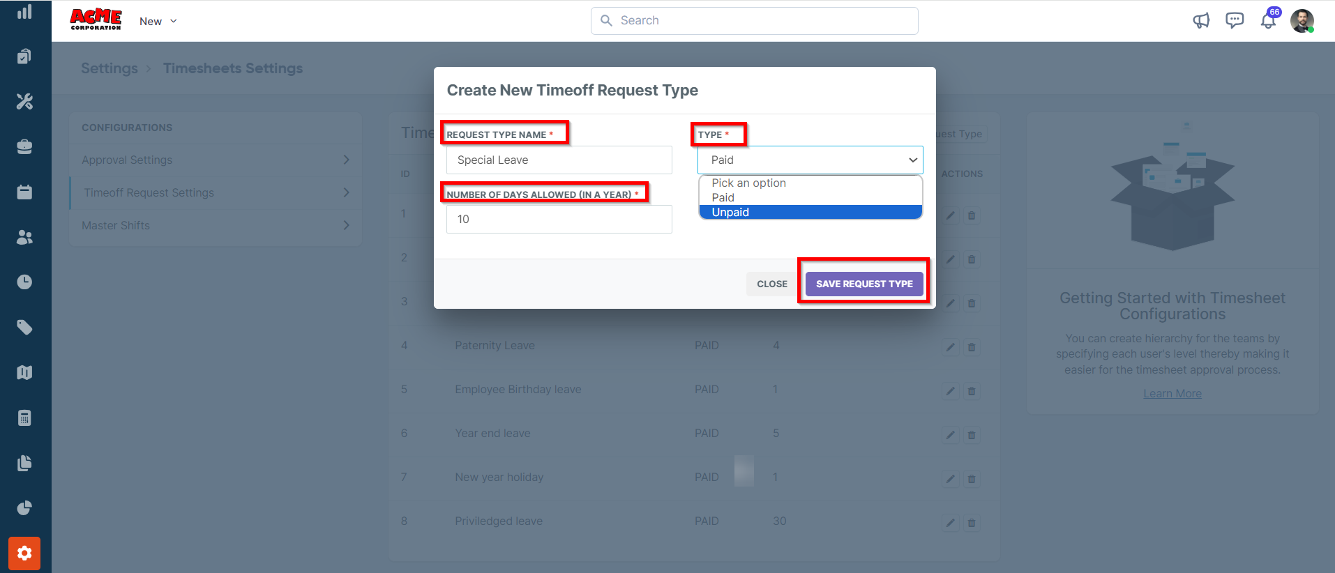 In this section, you can view and add new time-off request types. For each request type, you can specify whether it is paid or unpaid and the number of days allocated. To add a new time-off request type, follow these steps:
