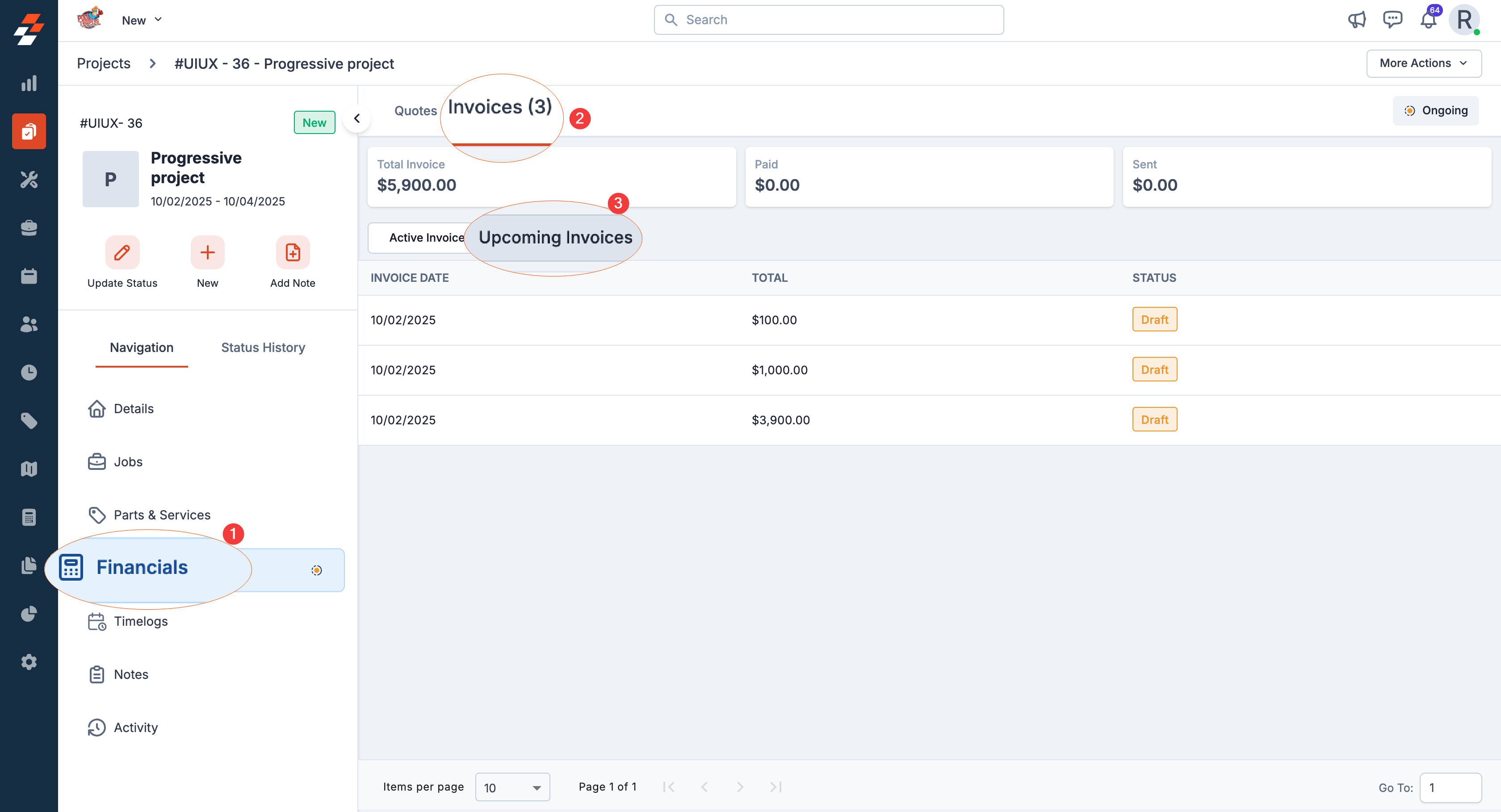 2. Choose any of the projects from the listing page to which you want to set up progressive invoicing. You will be redirected to the selected project details page.