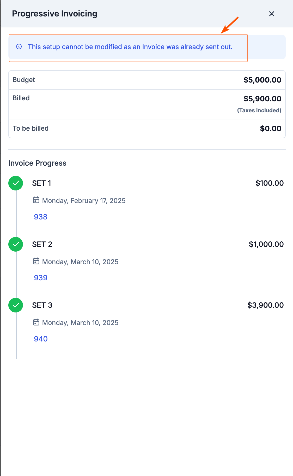Important: Once the first invoice from the progressive invoicing setup is sent and paid by the customer, the setup can no longer be modified.
