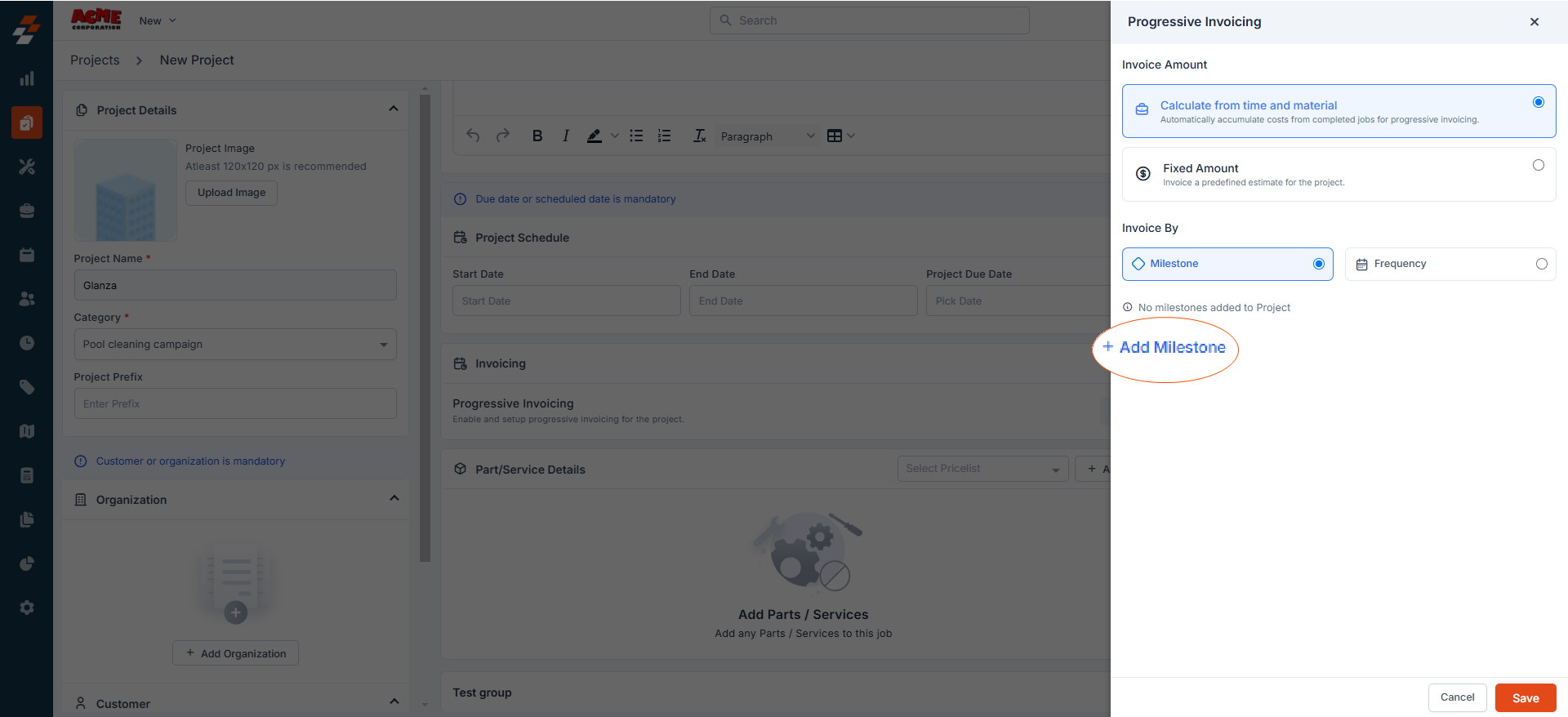 This option allows you to generate invoices upon reaching the specific milestone in a project, ensuring billing aligns with the project's progress. To use this option, follow these steps: