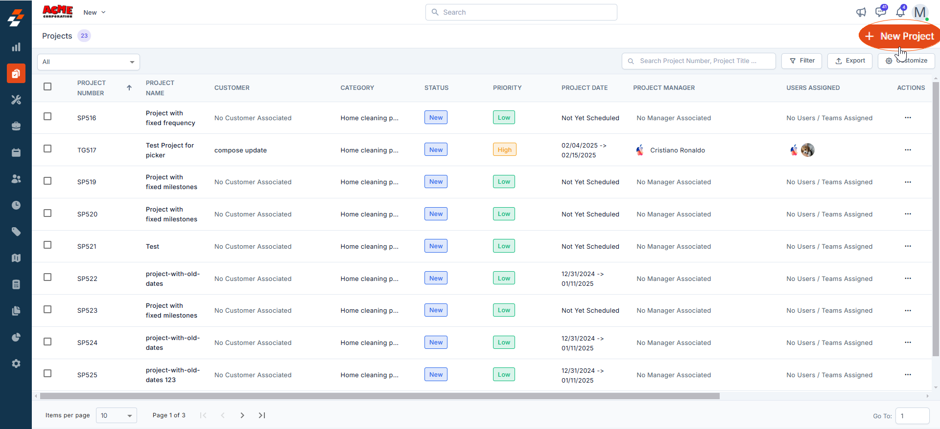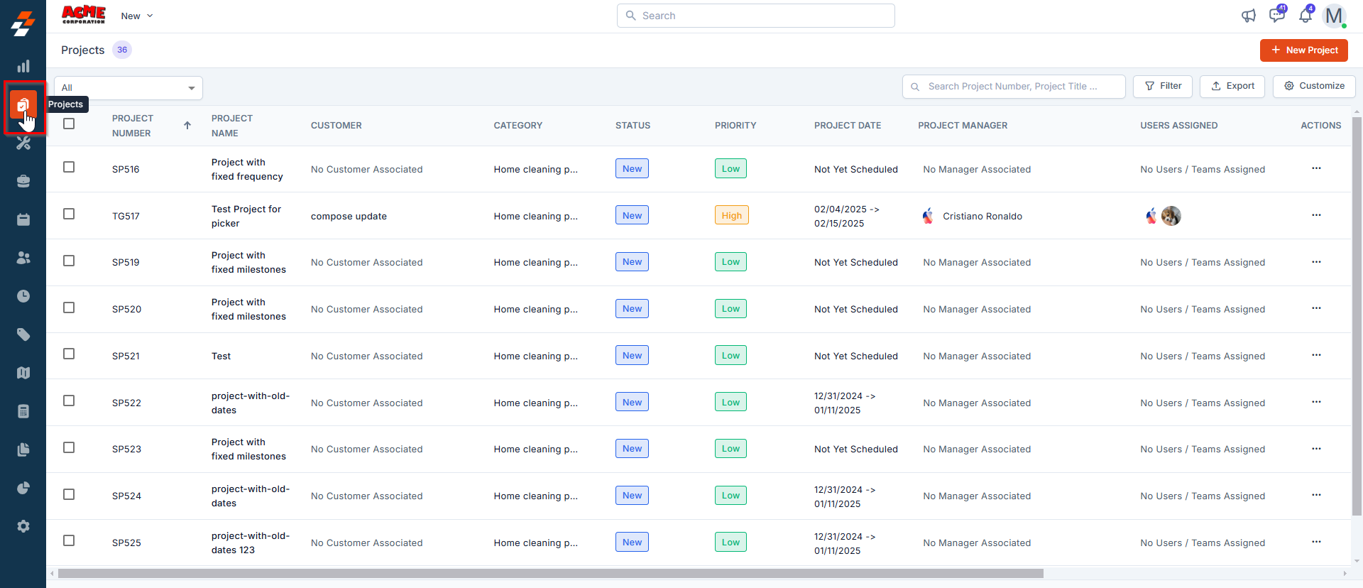 1. Select the “Projects” module from the left navigation menu. You can view the list of projects that have been created already on the projects listing page.