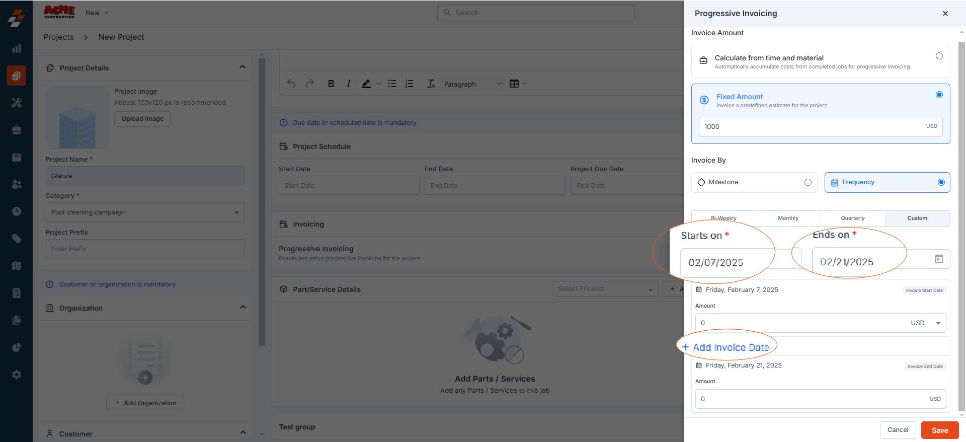 You can further customize your progressive invoicing by selecting the frequency when invoices should be generated: