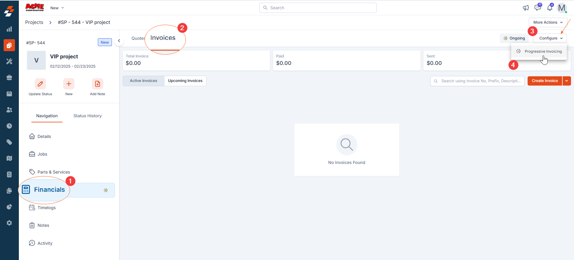 2. To view the progress of the invoices generated through progressive invoicing, click “Progressive Invoicing” under “Configure” in the financial section.