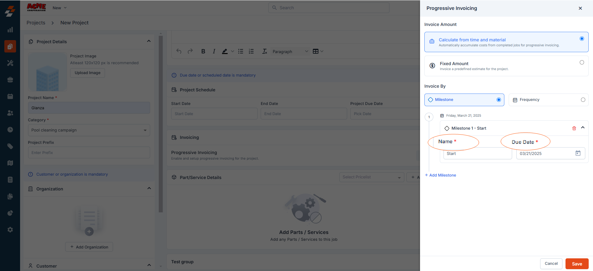 - When you select the “Calculate from Time and Material” option, the amount will be calculated automatically based on the actual material costs (i.e., sell prices of the parts and materials) included as line items in the completed jobs within the project, up to the specified milestone due date.